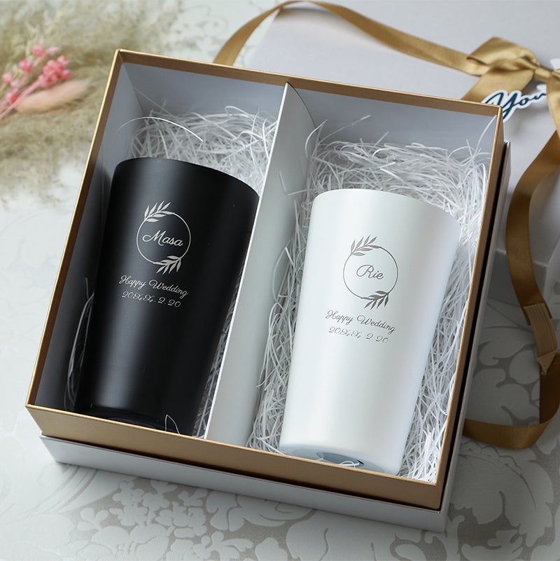 パーソナライズドギフトの代表例としては、ボールペンやグラス、お酒(瓶)、箸、リップ等の日常的に使えるアイテムがあります。(ギフト自体の物だけでなく、瓶や箱等のパッケージへの刻印の場合もあります。)