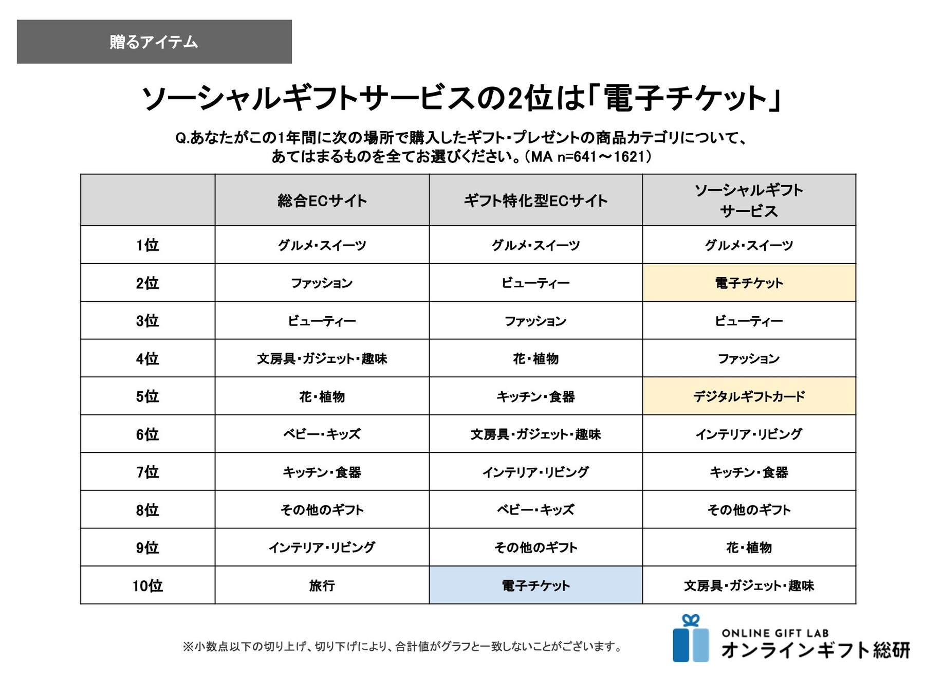③ギフト特化型ECサイトは総合的なカテゴリが並ぶ一方で、10位に「電子チケット」が入る結果となり、総合ECサイトとソーシャルギフトサービスの両方の特徴を融合させたような調査結果となりました。