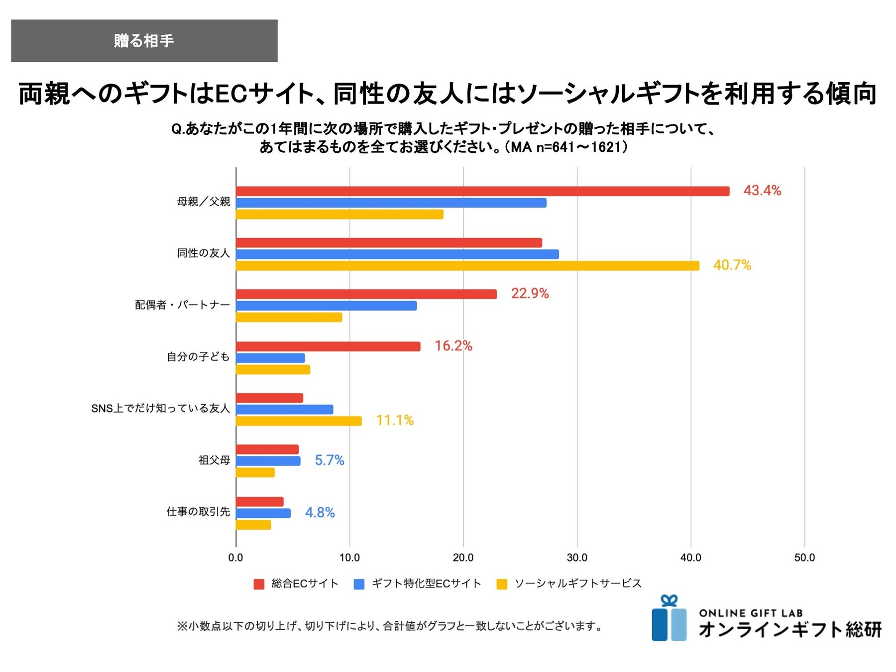 ①総合ECサイトは「母親/父親」43.4%、「配偶者・パートナー」22.9%、「自分の子供」16.2%と他チャネルに比べ高い結果となり、両親をはじめとした家族へのギフトが購入されている場所であることがわかりました。