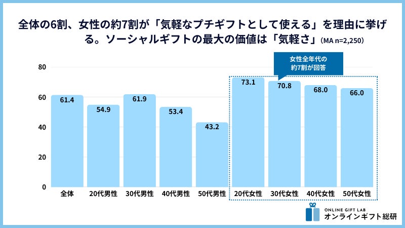A. 「気軽なプチギフトとして使えるから」が全体の61.4%でソーシャルギフトを贈る最大の理由です。特に女性では全年代で約7割がこの理由を挙げています。